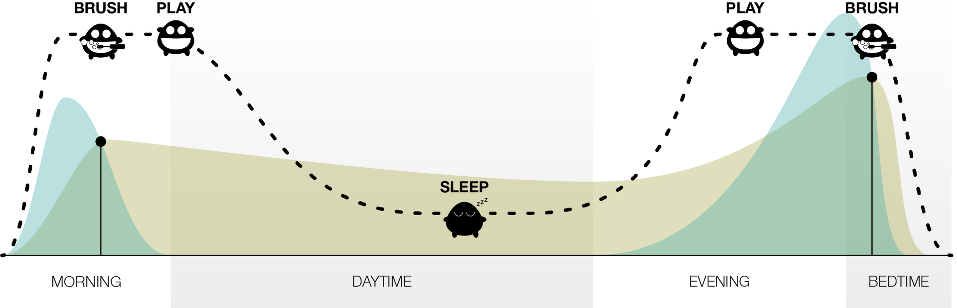 We also did extensive experience mapping with families to understand routines and rituals in a typical household, as well as capturing sentiments from kids and parents. We heard from kids that just brushing with their Sparkly got boring after a while and they wanted to be able to play with him/her/it. But we heard from parents that screens were a constant point of friction in the house and they were concerned that giving kids the option of "free play" with their Sparkly would disrupt the delicate balance and tight timelines of morning and evening routines.