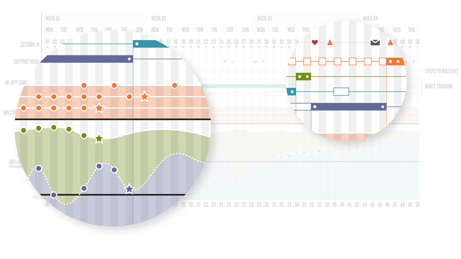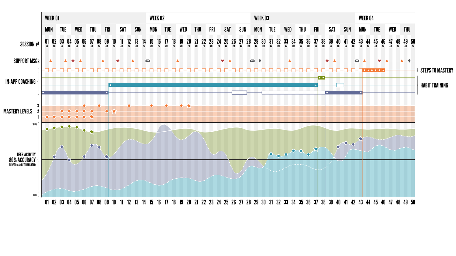 This visualization represents the overall “steps to mastery” coaching model for Sonicare for Kids (IoT device + mobile app), including the recommended cadence and density of communication delivered to the user.